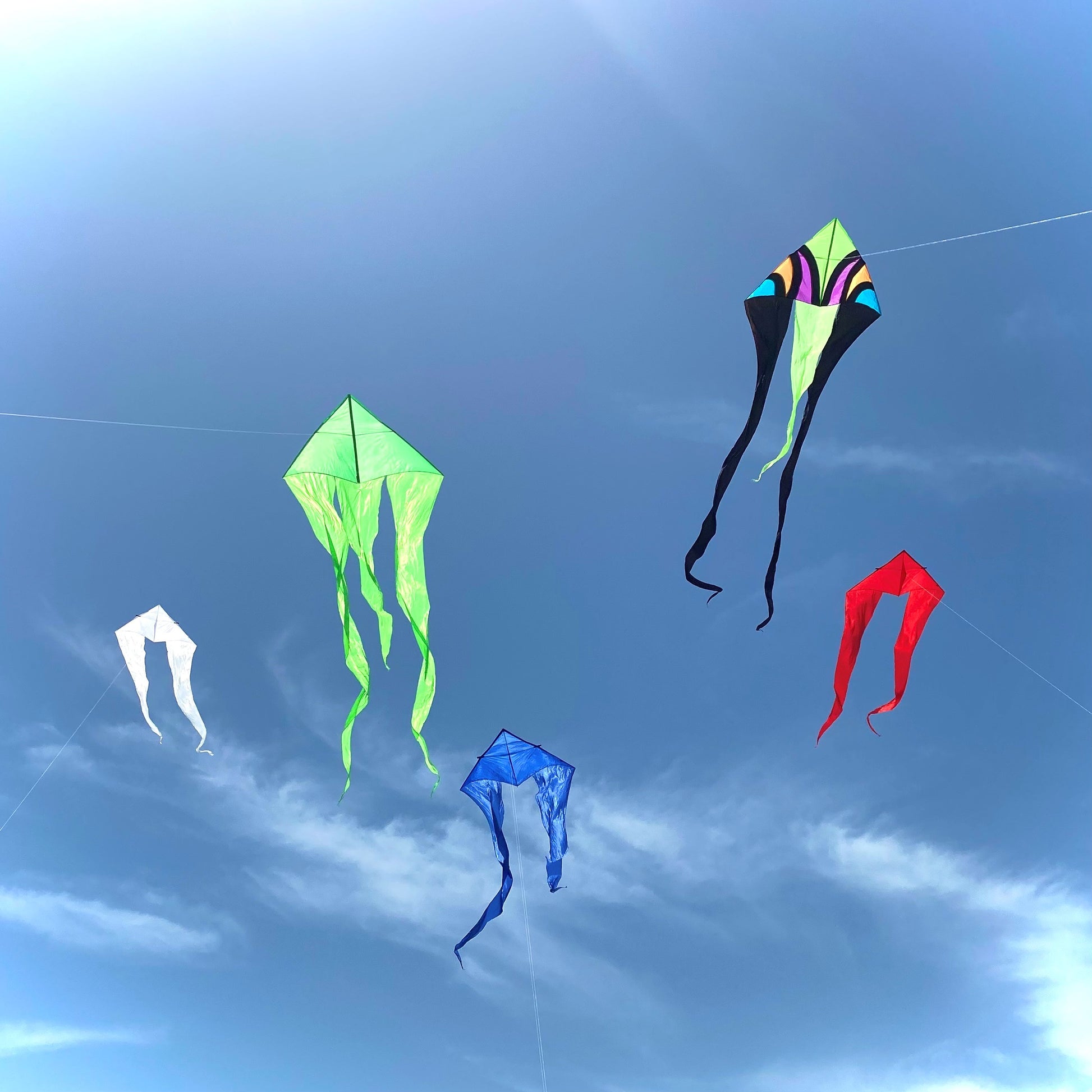 This 77" Wave Delta Kite is truly a sight to see in the sky! Despite its large size, it takes flight effortlessly and glides smoothly on the breeze. Its flowing tails create a mesmerizing effect as they dance in the wind. Bold and vibrant, this colorful kite brings fun for the entire family!