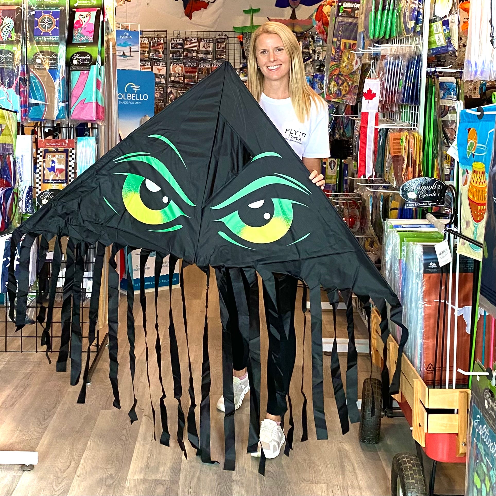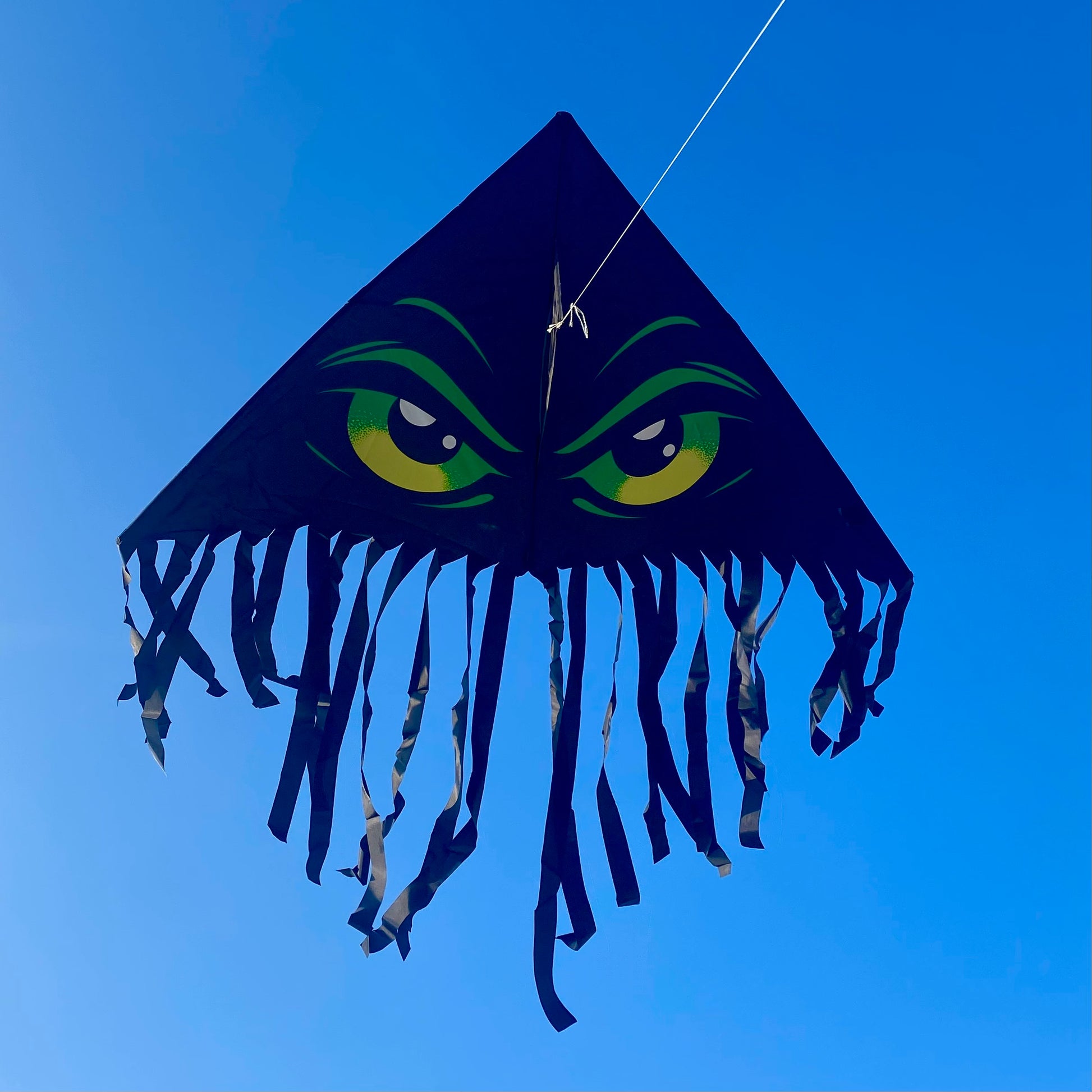 Unleash the mystery of the skies with The Watcher, a striking 5-foot delta kite that’s as eerie as it is mesmerizing. Its sleek black sail is pierced by two glowing, green, otherworldly eyes that seem to stare into your soul (or maybe just down at the beachgoers below). Adding to its drama, long fringy tails ripple and flutter like ghostly whispers as it flies in the sky.