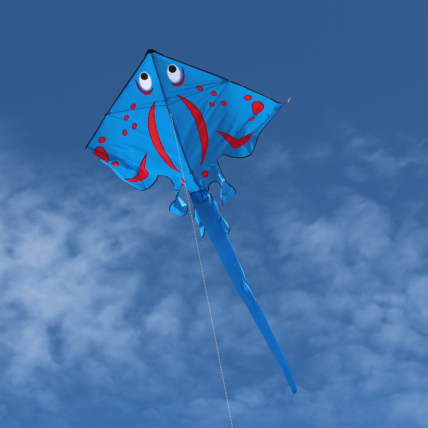 With a 6-foot wingspan, the Stingray Kite is designed for easy flying, and its stinger tube tail adds impressive stability. The intricate applique design lets sunlight shine through, illuminating its vibrant colors. At over 11 feet tall, this kite creates a breathtaking sight as it glides gracefully across the sky.